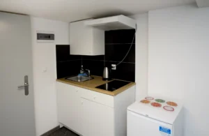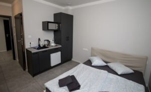 Studio oferuje dwa osobne miejsca do spania: jedno bardzo duże, ponad dwumetrowe łóżko podwójne oraz dodatkowe łóżko pojedyncze. Do dyspozycji gości jest prywatna łazienka z prysznicem typu walk-in oraz w pełni wyposażony aneks kuchenny, w którym znajduje się płyta grzewcza, lodówka, kuchenka mikrofalowa, czajnik elektryczny oraz niezbędne przybory. W pokoju przygotowano również zestaw do parzenia kawy i herbaty, biurko do pracy, stół oraz szafę na ubrania. Wyposażenie obejmuje telewizor z płaskim ekranem i dostępem do serwisów streamingowych, bezpłatne Wi-Fi, świeżą pościel oraz ręczniki, a w całym studio obowiązuje całkowity zakaz palenia.